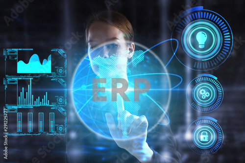 The concept of business, technology, the Internet and the network. A young entrepreneur working on a virtual screen of the future and sees the inscription: ERP