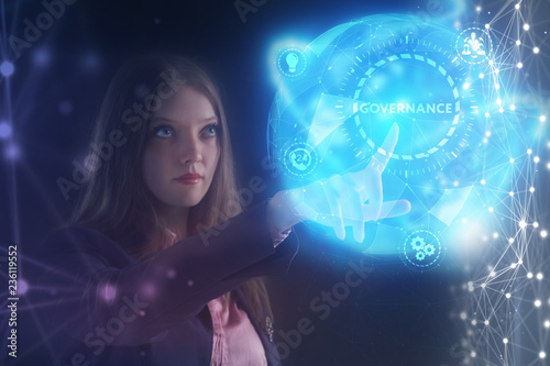 The concept of business, technology, the Internet and the network. A young entrepreneur working on a virtual screen of the future and sees the inscription: Governance