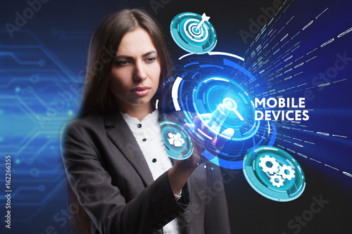 The concept of business, technology, the Internet and the network. A young entrepreneur working on a virtual screen of the future and sees the inscription: Mobile devices