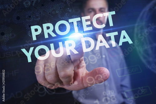 The concept of business, technology, the Internet and the network. A young entrepreneur working on a virtual screen of the future and sees the inscription: Protect your data