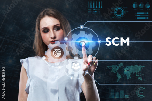 The concept of business, technology, the Internet and the network. A young entrepreneur working on a virtual screen of the future and sees the inscription: SCM