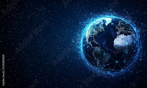 The concept of digital technology and global network is represented by a digital globe with blue circuit board lines on a dark background