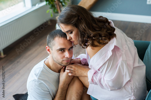 The concept of healthy happy relationship of a married couple. The girl is sitting in a chair, and the guy is sitting in front of her and holding her hands.