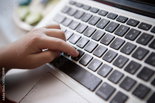 The concept of learning and playing children on a computer.Children's hand presses the buttons on the keyboard. Horizontal.Shot close-up.The problem of modern children. Baby and screens.Home education