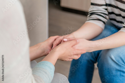 The concept of mental health, a psychologist sits and touches the hand of a young depressed person for encouragement. moral support of a person in a difficult life situation
