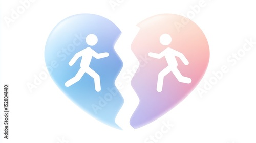 The concept of not reconciling or understanding each other. A cracked heart icon with two people walking away in opposite directions, showing emotional breakdown.