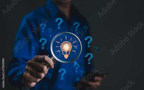 The concept of using creative thinking to help solve problem. Innovation patent, Find solution, think idea, Businessman holding magnifying glass icon with many idea light bulb and question marks.