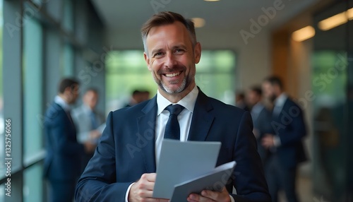 The Confident Leader: A distinguished, smiling businessman holding documents in a modern corporate setting, exuding confidence and approachability.