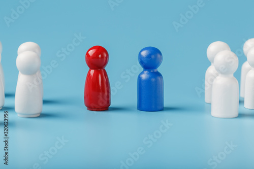 The conflict between two companies and a business, the rivalry of Leaders in blue and red leads a group of white employees to compete, Staff recruitment.