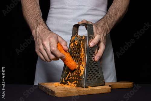 The cook rubs carrots on an old grater on a black background. The concept of cooking. Vegetarian food