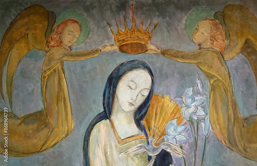 The Coronation of the Virgin Mary, Mother of God, in heaven by the Holy Trinity. Le Couronnement de la Vierge Marie, Mère de Dieu, au paradis par la Sainte Trinité.