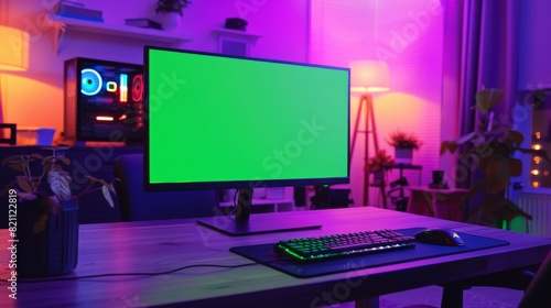 The cozy room with modern design is lit with warm, neon lighting, and there is a powerful personal computer gamer rig on the table.