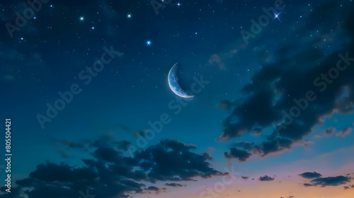 The crescent moon and the star in dark blue sky with clouds at night