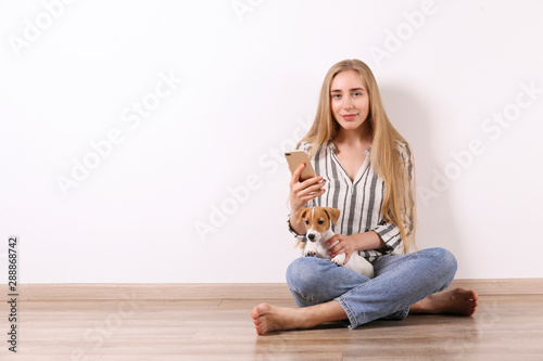 The cutest two months old Jack Russel terrier puppy with beautiful blonde young woman. Small adorable doggy with funny fur stains lying with owner. Close up, copy space, isolated background.