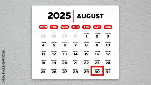 The date August 30th marked with a red cursor on the wall calendar 2025