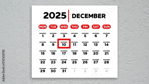 The date December 10th marked with a red cursor on the wall calendar 2025