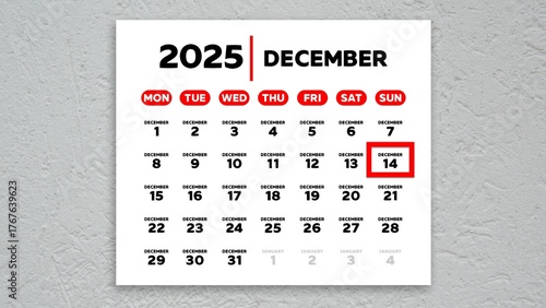 The date December 14th marked with a red cursor on the wall calendar 2025