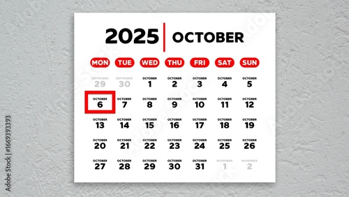 The date October 6th marked with a red cursor on the wall calendar 2025