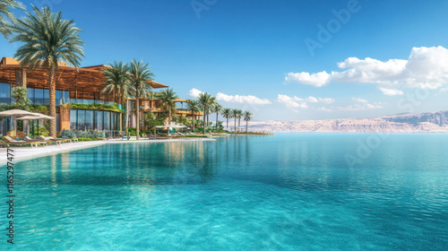The Dead Sea shoreline with a high-end resort, turquoise water with visible salt layers, and delicate cloud reflections enhancing the scene
