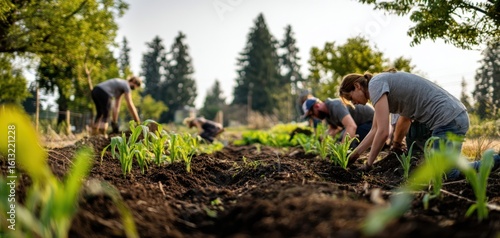 The dedicated gardeners nurturing young plants in a vibrant, sunlit field.