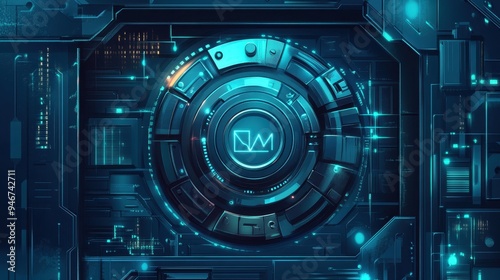 The design showcases a high-tech safe deposit box in vibrant blue hues, set within a digital environment filled with intricate circuitry