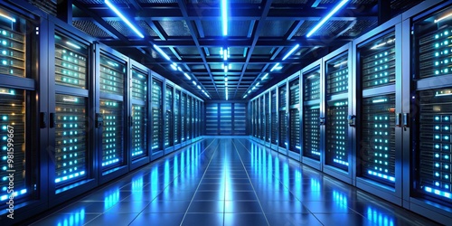 The Digital Heart Server Room with Blue Lights and Reflective Floor, data center, server, technology