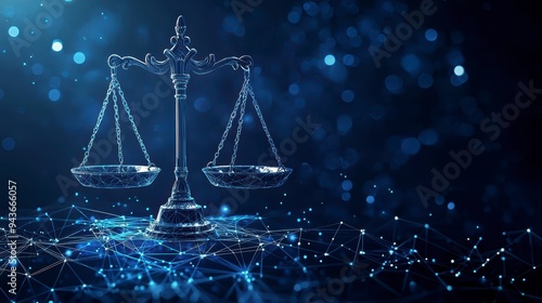 The digital scales of justice against the backdrop of data and code symbolize the rule of law in the virtual world