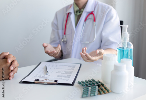 The doctor consults the patient to diagnose the disease and find a cure for symptoms. While writing information and prescriptions in a clinic or hospital office