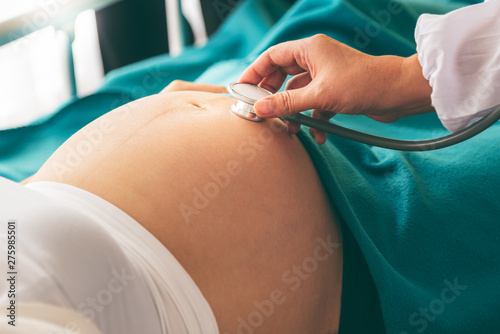 The doctor is using a medical stethoscope To listen to the sound And the movement of the baby Which is in the moter's stomach, to pregnant and health concept.