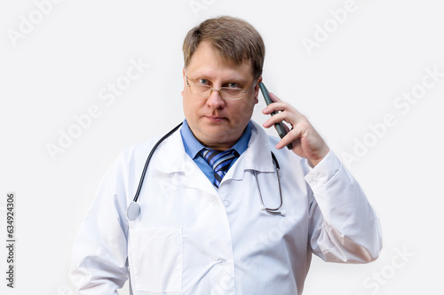 The doctor shows with gestures that calling on a smartphone, the concept of a medical consultation on the phone.