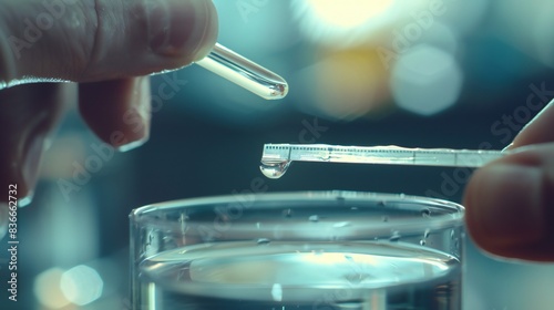 The doctor's hand inserting a test strip into a water sample for contamination testing.