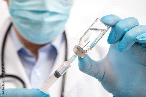 The doctor's hand wearing blue gloves against white background and holding Covid-19 vaccine.