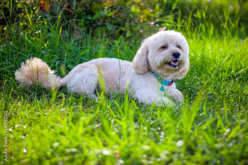The dog sleep at the view, Looking up brown cute poodle puppy sitting on ground, Cute white poodle dog on green park background, background nature, relax pet, puppy poodle dog sit down looking