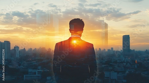 The double exposure image of the businessman standing back during sunrise overlay with cityscape image. The concept of modern life, business, city life and internet of things.