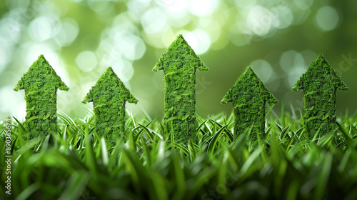 The drawing shows upward pointing arrows made of lush green grass, representing progress in ecology and sustainability.