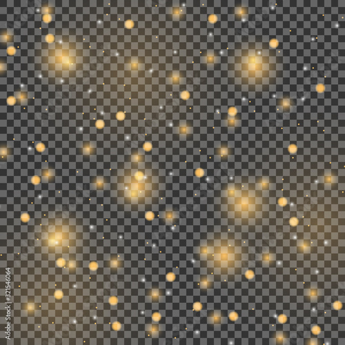 The dust sparks and golden stars shine with special light. Vector sparkles on a transparent background. Christmas light effect. Sparkling magical dust particles.