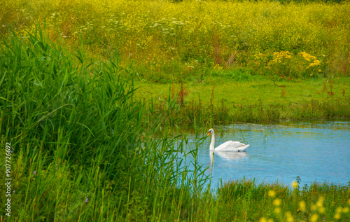 The edge of a lake with reed and wild flowers in summer, at sunrise, Almere, Flevoland, The Netherlands, August 2, 2024