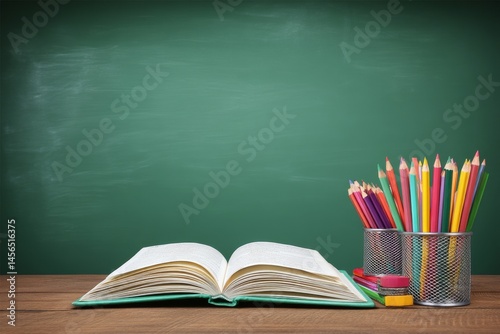 The education and reading concept is represented by a wooden table in a classroom, topped with a variety of colorful books and set against a blackboard