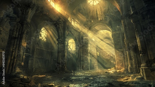 The eerie ethereal light shining through the jagged holes of the ruins giving off an otherworldly presence in the abandoned space