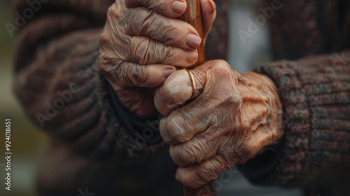 The elderly hands holding cane