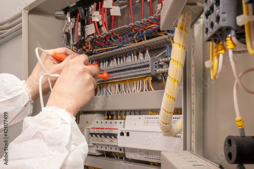 The electrician engineer tests, repairs the electrical control circuitry of the electrical system. Control cable.