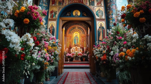 The entrance of an Orthodox church decorated with flowers and icons, welcoming parishioners inside.
