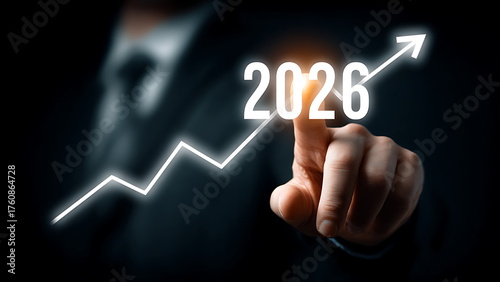 the entrepreneur pointed to the year “2026” as part of a graph showing an upward trend, indicating economic and business growth.