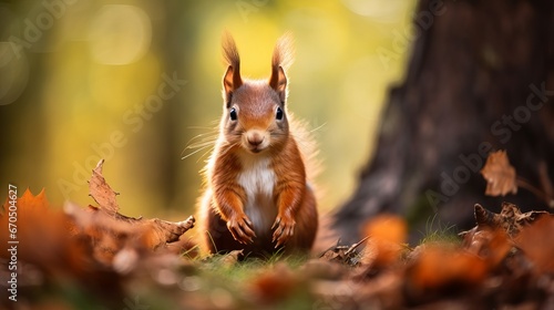 The Eurasian ruddy squirrel (Sciurus vulgaris) in its common environment within the harvest time woodland. Representation of a squirrel near up. The timberland is full of wealthy warm colors