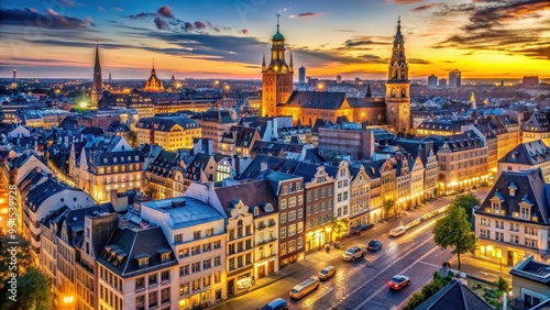 The Evening European cityscape with illuminated buildings and bustling streets , Europe, evening, cityscape, buildings