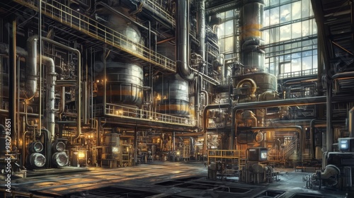 The extensive industrial infrastructure of a chemical plant, including piping, reactors, And heavy machinery