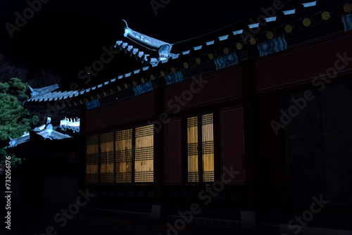 the exterior of an illuminated traditional Korean building at night