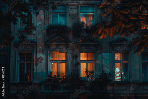 The facade of a classical building in the evening and the people inside the apartments
