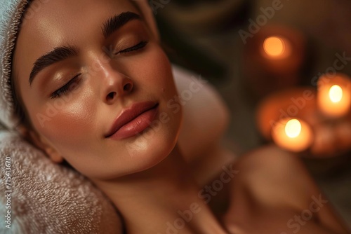 The face of a beautiful relaxing woman against the background of blurry candle lights. The concept of healing, relaxation, rejuvenation and restoration of the body.