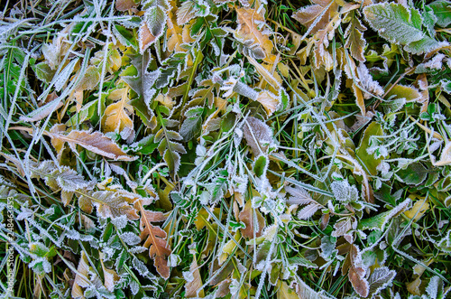 The fallen yellow foliage lies on the grass during the first frost.